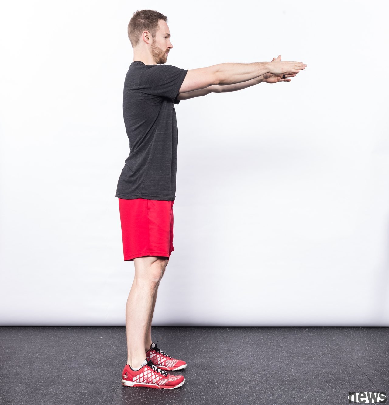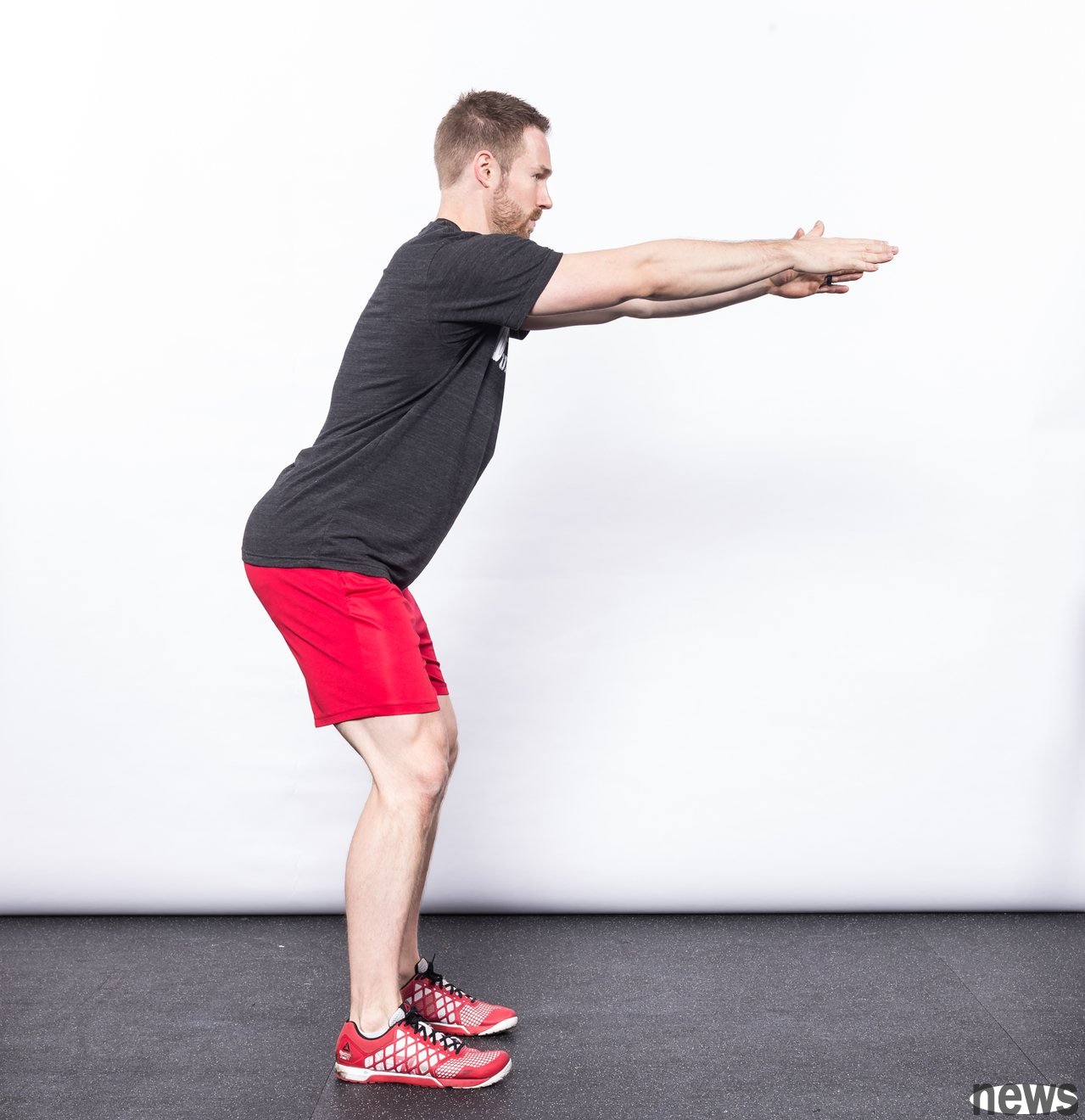 When you reach the full squat depth, you will feel stable and balanced, and the weight should be balanced in the middle of your palm. In this position, a vertical line from the center of gravity of your body should pass through the middle of your palm.