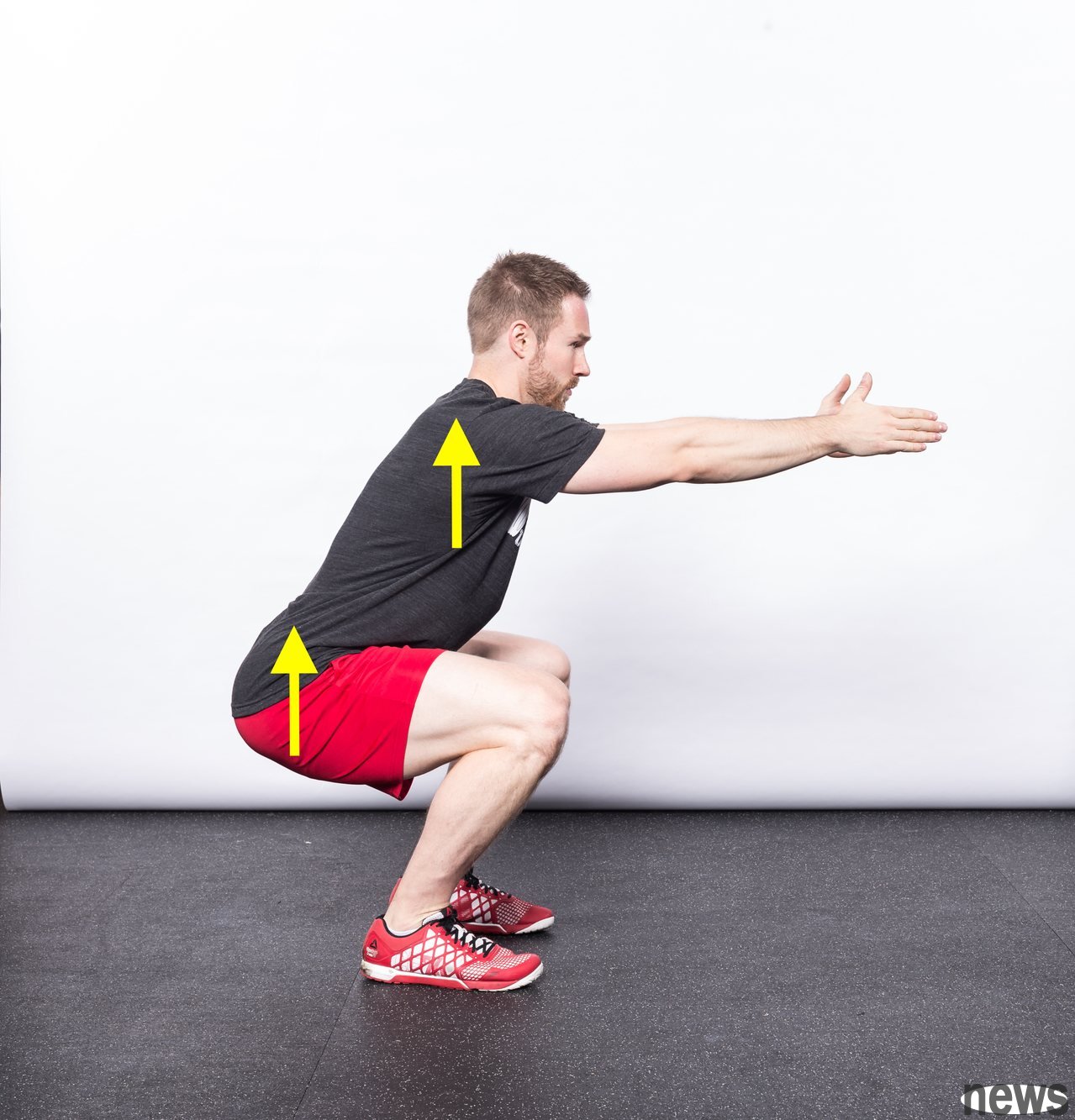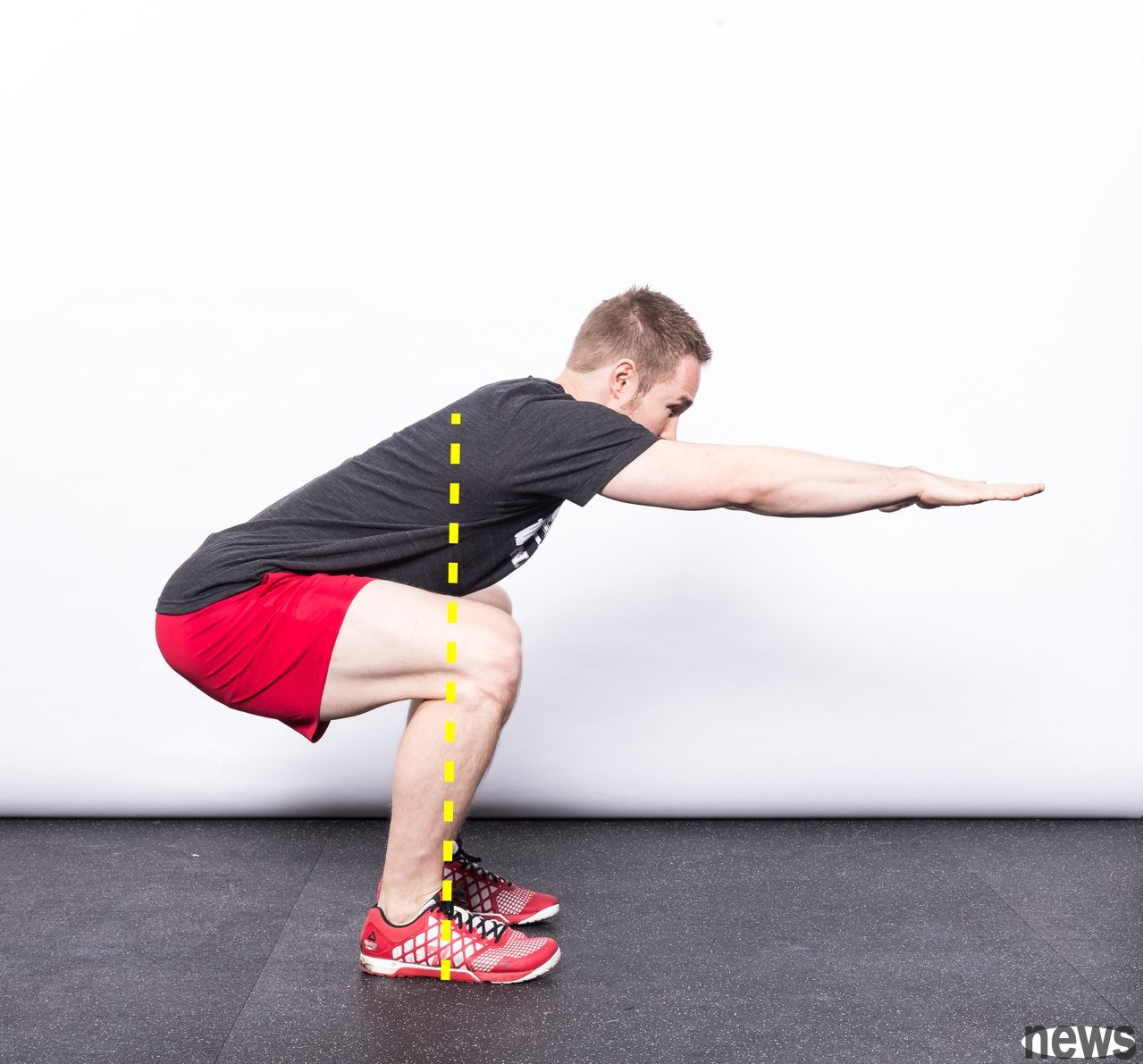 When squatting, the longer you can keep your calf vertical, the better. When we can't keep our calf vertical floor as much as possible, the knees will move forward too quickly over the tip of the foot, and the knees will increase knee joint pressure and make the picker lose balance.