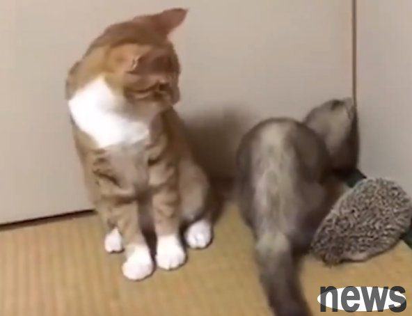 Orange and white cat: Mr. Ferret, do you want to explain what this new thing is? Ferret: No~ I just happened to pass by to check my presence.