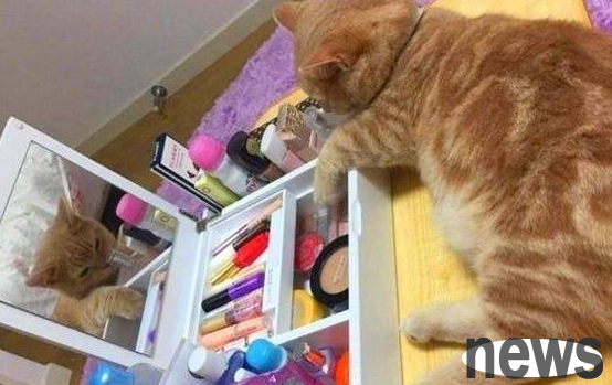 The orange cat sat in front of the dressing table, looking at the various cosmetics in front of him. He was a little confused. He didn't know how to use so many things. What should he do? If the painting was ugly, then no cat would like it. While the cat was thinking, he accidentally saw himself in the mirror and was instantly stunned.