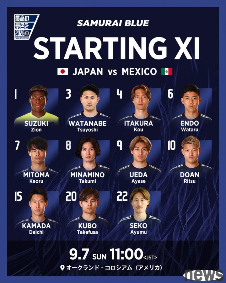 Football Friendly Match, Mexico vs Japan. The starting lineups of both sides were released before the game. Japan's first starters: 1-Azuki Aiyan, 4-Oitura Kamaba, 3-Takashi Watanabe, 22-Se Kotomi, 6-Endo Koto, 8-Mino Takumi, 15-Kashida Oji, 7-M...