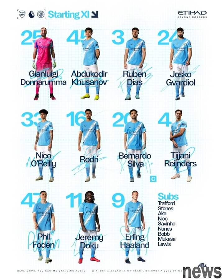 Manchester City starter: 25-Donaluma, 45-Husanov, 3-Ruben -Dias, 24-Gwadior, 33-O'Reilly, 16-Rodri, 20-B Seat, 4-Reindez, 47-Fourden, 11-Doku, 9-Haland