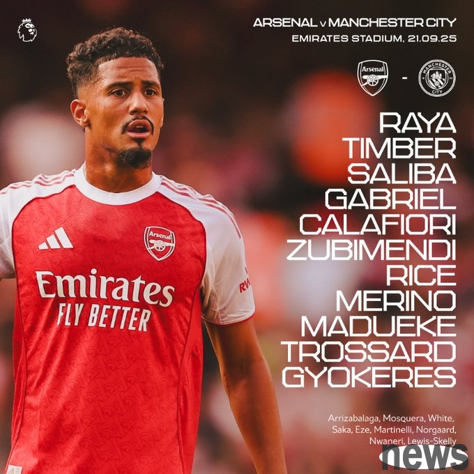 Today, at 23:30, Arsenal will face Manchester City at home in the fifth round of the Premier League. The starting lineup before the game has been announced! Arsenal starter: 1-Laiah, 12-Timber, 2-Saliba, 6-Gabriel, 33-Calafiori, 36-Suvimendi, 41-Rice...
