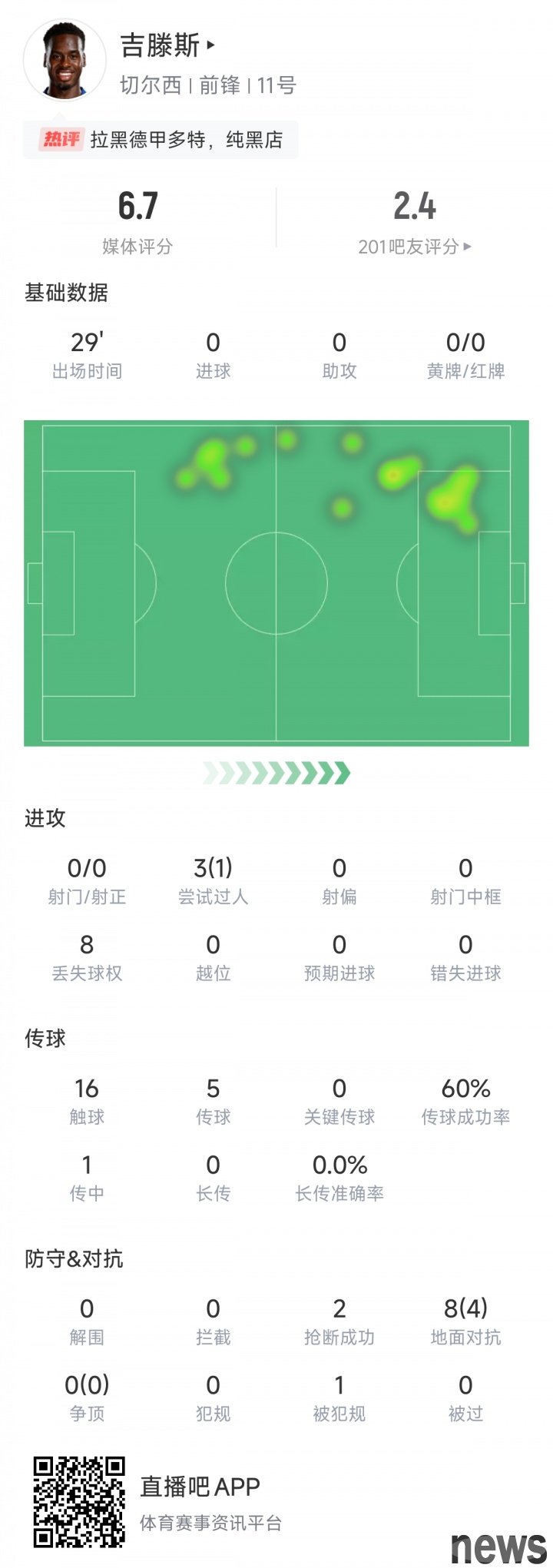 In recent games, Gittens started to play against Lincoln City, the first team, and made no achievements in 70 minutes. In the match between Chelsea lost to Bayern, Manchester United and Brighton, Gittens all sat on the bench and failed to play. In this game, Gittens played 29 minutes, touched 16 and lost the ball, 1 of 3 passes 1, 60% success rate of 5 passes, 8 against 4, and 0 key passes.