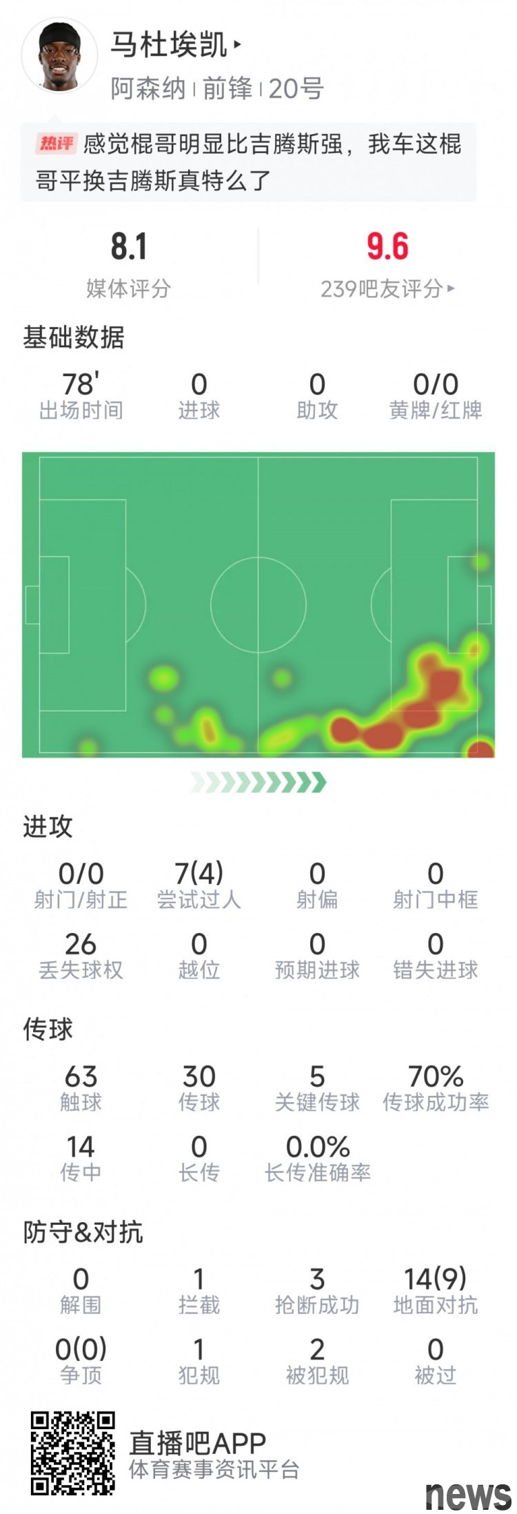 In this round of Premier League Arsenal's match against Nottingham Forest, Maduaike performed well. The following is his data in this game: