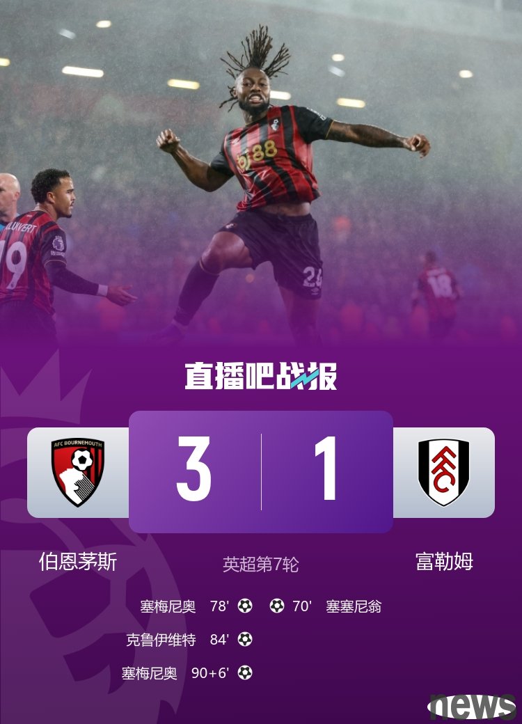 Semenho one-stop + double hit, Bournemouth reversed Fulham 3-1 at home, unbeaten in 6 rounds of the Premier League!