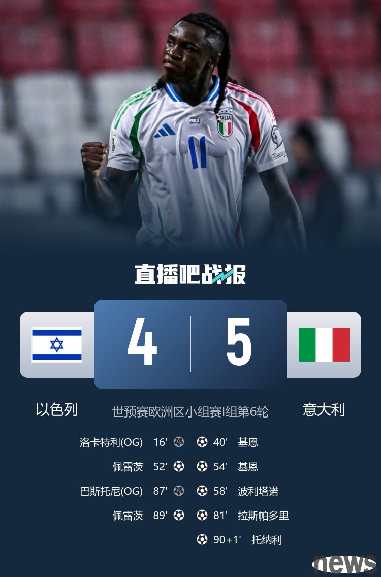 【Competition Report】 Crazy game! Italy beat Israel 5-4 and rose to second place. Keane scored twice. Rettgi scored 3 assists World Cup qualifiers European Group I in the 6th round of the European Group I group stage, Tonali scored a final victory, K...