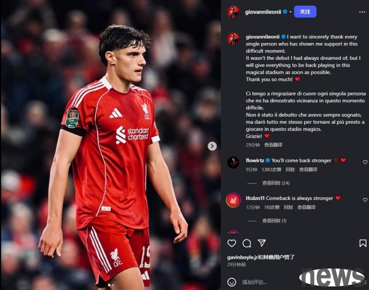 According to famous reporter Romano, Liverpool's 18-year-old central defender Leoni has a torn cruciate ligament and will be out of the game for several months to strive for a return at the end of the season. Leoni has just updated his social media.