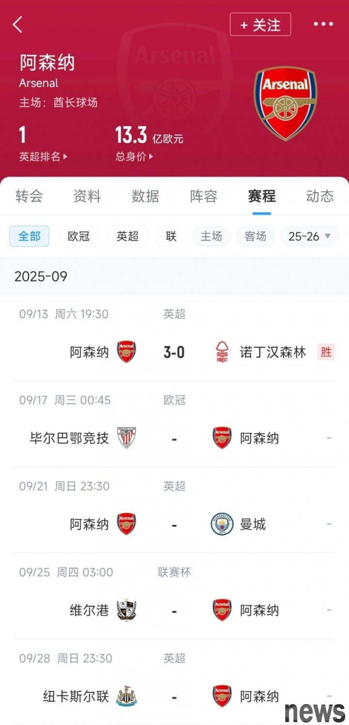 From September 13th to 28th, Arsenal will play 5 games in these 16 days, and the Gunners have easily won Nottingham Forest. Then there will be the midweek Champions League match three days later, against Biba. Arsenal will play against Manchester City in the Premier League next weekend, and then the League Cup against Port Vier and away against Newcastle United on the 28th of the month.
