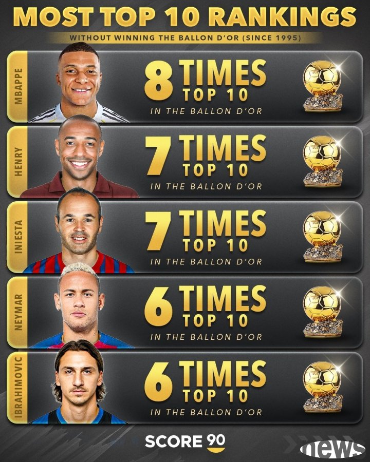 According to foreign media score90 statistics, Mbappe was shortlisted for the top ten of the Golden Globes 8 times, but never won the award, with the most in history.
